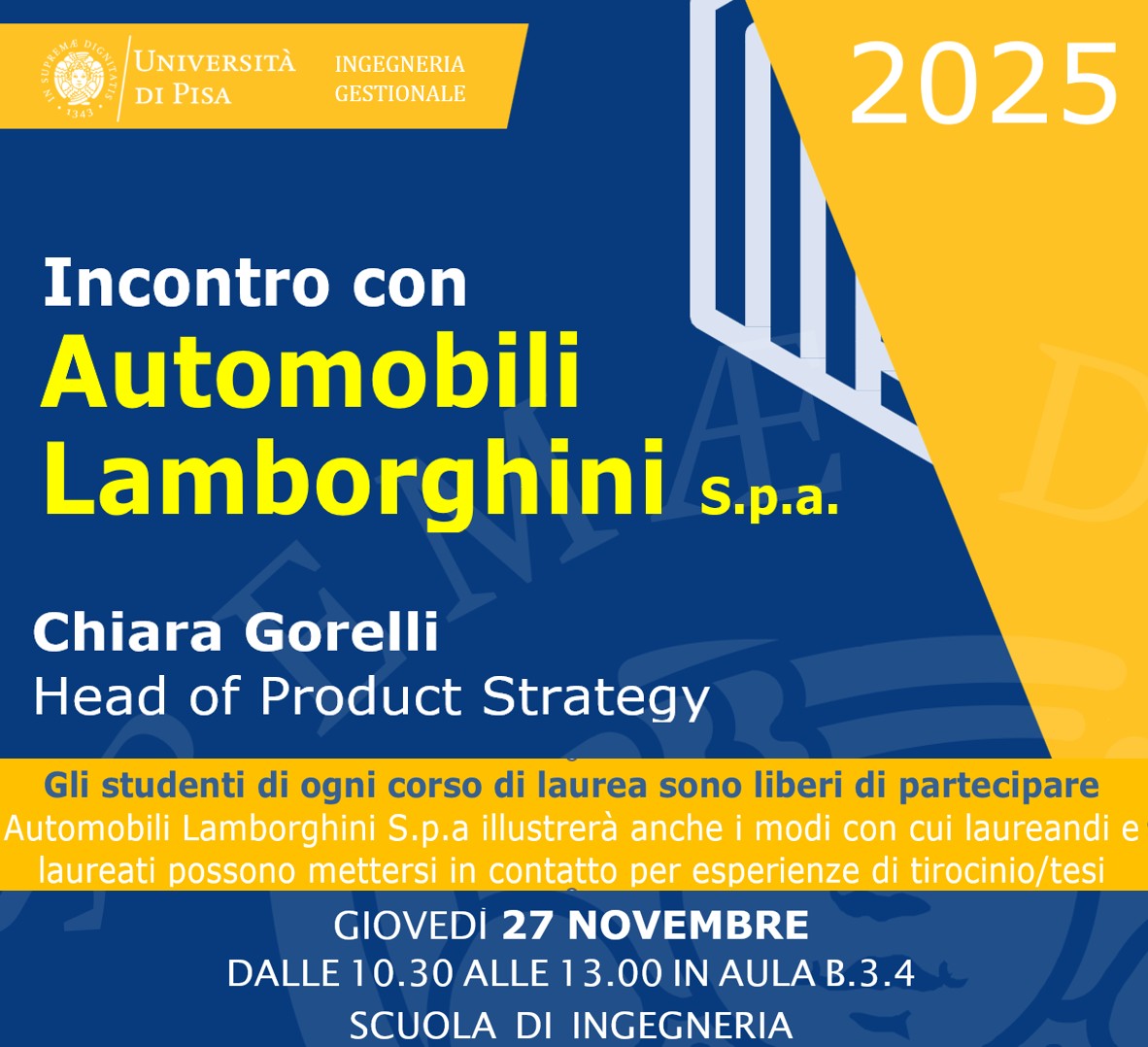 Il Prof. Gionata Carmignani organizza un incontro con Automobili Lamborghini S.p.A., prestigiosa azienda leader del settore automobilistico di alta gamma. L’incontro sarà tenuto da Chiara
